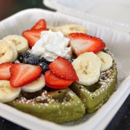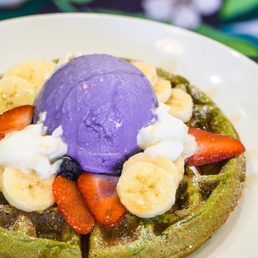 I ordered for the first time here because the matcha waffle with ube looked so Ono! I only found the matcha waffle with fruit trio on the menu so I ordered that. I also got the ahi tempura bowl that was buy one get one free! They were so fresh and delicious! I filled up on the bowl so I only had a triangle of the waffle. I'll have breakfast and lunch tomorrow too. So ono!